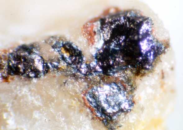 Sammlung: Ralf Dietter ; Foto: Ralf Dietter Das Mineral Bornit ist leicht mit dem Chalkopyrit zu verwechseln, da es ähnliche Anlauffarben macht wie dieses.